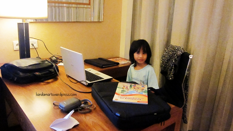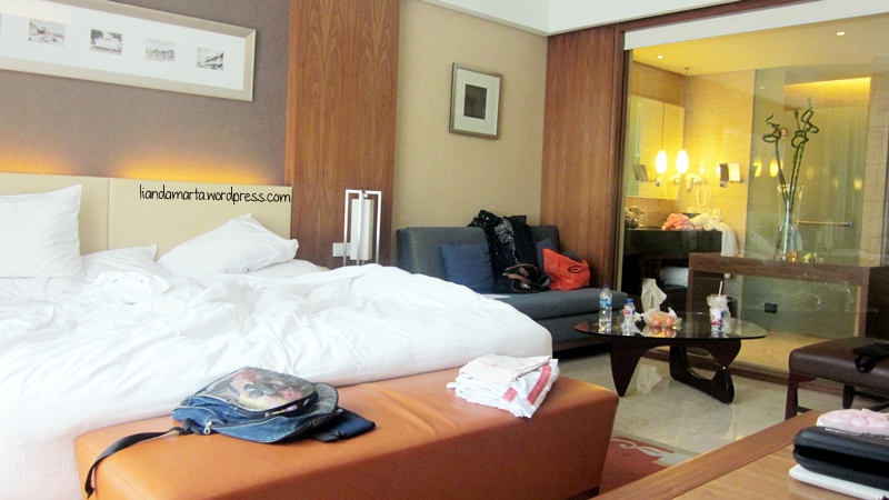 Saya sempat norak sih ya pas masuk ke kamarnya. Baru kali ini bok akik nginap di kamar hotel bintang lima. Jadi maap maap aja nih ya kalo rada norak :lol:. Saya sama si Salsa heboh deh ngulik-ngulik segala yang ada di kamar. Terutama si kamar mandinya. Jadi kamar mandinya itu modelnya kayak aquarium gitu, dinding kaca yang menghadap ke tempat tidur. Malu mandi buka-bukaan? Tenang aja ada tirainya kok yang bisa dinaik-turunin pake remotenya. Canggih gak tuh? πŸ˜†Β Fasilitas di kamarnya juga super lengkap. Peralatan mandinya tentu saja dari produk ternama. Trus di kamar ini ada iron setnya juga, cocok banget deh buat saya yang suka risih kalo baju/jilbab rada kusut. πŸ˜€ Yang bikin sedikit kecewa adalah akses wifinya yang terbatas banget, kalo mau puas ada charge tambahannya. 😦