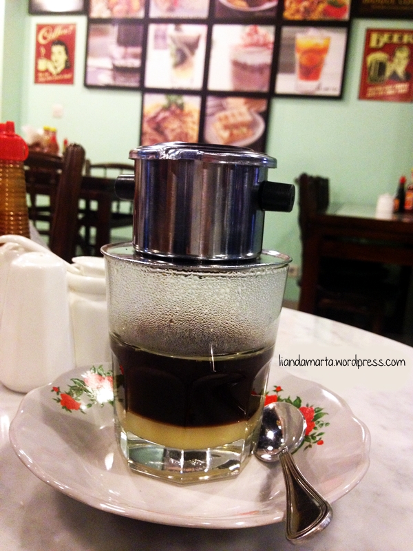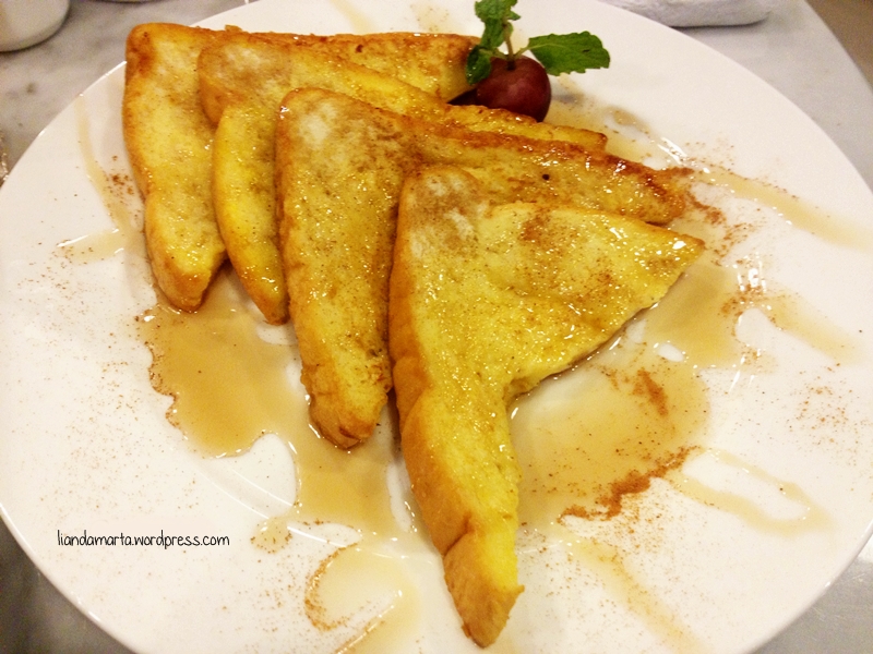 Setelah abis melahap semua hidangan utama, saya dan Abang langsung ‘cuci mulut’ dengan dessert-nya (ya kali dessert-nya karbo lagi haha) : Roti Perancis. Nama aslinya saya lupa apaan, tapi ya begitulah intinya, hehehe. Rotinya sih roti tawar biasa yang disiram dengan caramel sauce. Rasanya maniiiiiiiiis banget. Tapi, rasanya yang manis banget itu memang pas sekali jadi ‘partner’-nya si black coffee. 🙂