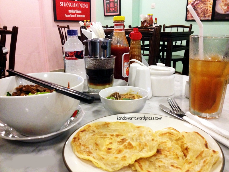 Si Abang tanpa ba-bi-bu langsung pesen Bakmi Ayam Kepiting dan Koffie Susu Indotjina. Sementara saya setelah mikir cukup lama dan bolak balik buku menu berkali-kali, akhirnya memutuskan untuk memesan Prata Kari Ayam dan Ice Lemon Tea. Bukan menu khas Kopi Oey juga sih, abis ya gimana dong, saya gak doyan kopi dan si Pratanya manggil-manggil genit minta diorder. Jadi, ya sudahlah. Untuk dessert-nya saya dan Abang memesan (yang katanya) Roti Perancis. Hmm..