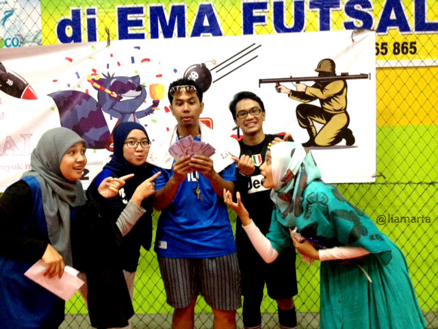Long story short, sampailah kita di lapangan futsal. Dan, dari total 6 orang anggota yang terdaftar di tim saya dan Abang, yang datang cuma 4 orang aja dooong. Sedangkan tim lain pada komplittt. Trus kepikiran ngajakin Kresna, sepupunya Abang yang belum dapat tim. Pas dilihat-lihat kok ya tim ini semua serba minjam. Mulai dari saya yang minjam baju, Abang yang minjam kacamata, Kak Icha yang minjam manset, Fenny yang minjam celana, dan bahkan pemain pun kita minjam karena kekurangan. -____-