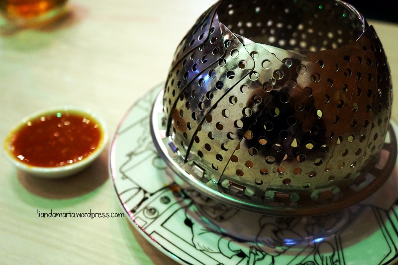 Sebagai tambahan kita kemarin memesan Hargau, dimsum yang isinya udang dan disajikan dengan saus sambal gitu. Ah sebagai pecinta dimsum, sepertinya ini menu yang bakal sering saya pesan kalo kesini. Udangnya besar-besar dan ketika dicocol ke saus sambal tentu aja rasanya nikmat hehehe. Oh iya, penyajian si Hargau ini unik juga loh.