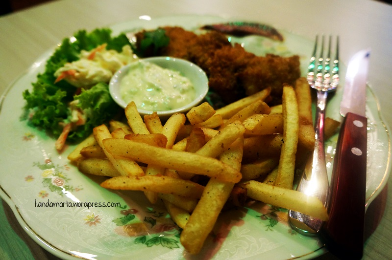 Saya kemarin pesan Sailor Plate. Isinya fish and french fries dengan saus tar-tar gitu. Saya sukaaa. Semuanya rasanya pas. Dan french friesnya bakal jadi favorit saya nih, soalnya ngingetin sama french friesnya mekdi. Suka suka suka! πŸ˜€