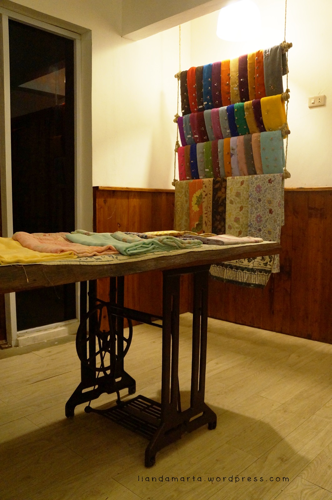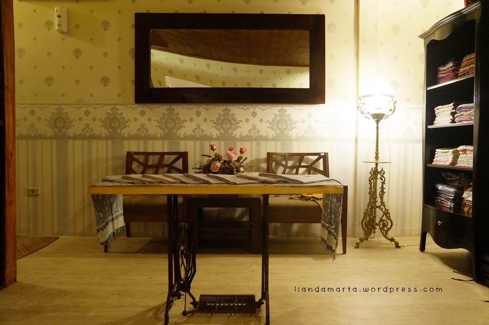 Sampai di Tiaz pas banget jam makan malam ya, sekitar jam 8 malam. Dan itu superrrr rame! *phew* Sampai tempat duduk aja full semuanya. Untunglah saya dan Abang masih dapat tempat pewe. Saya sempat explore cafe ini lagi, terutama di area Rumah Batiknya. Ga berani ngelirik ke kain batik yang dijual, takut ngiler pengen beli hahaha. Dan saya baru ngeh kalo ternyata beberapa meja yang digunakan di cafe ini (terutama meja yang modelnya dining table gitu), adalah mesin jahit loh! Di postingan review saya sebelumnya kayanya gak terlalu kelihatan, tapi coba lihat di foto-foto berikut :