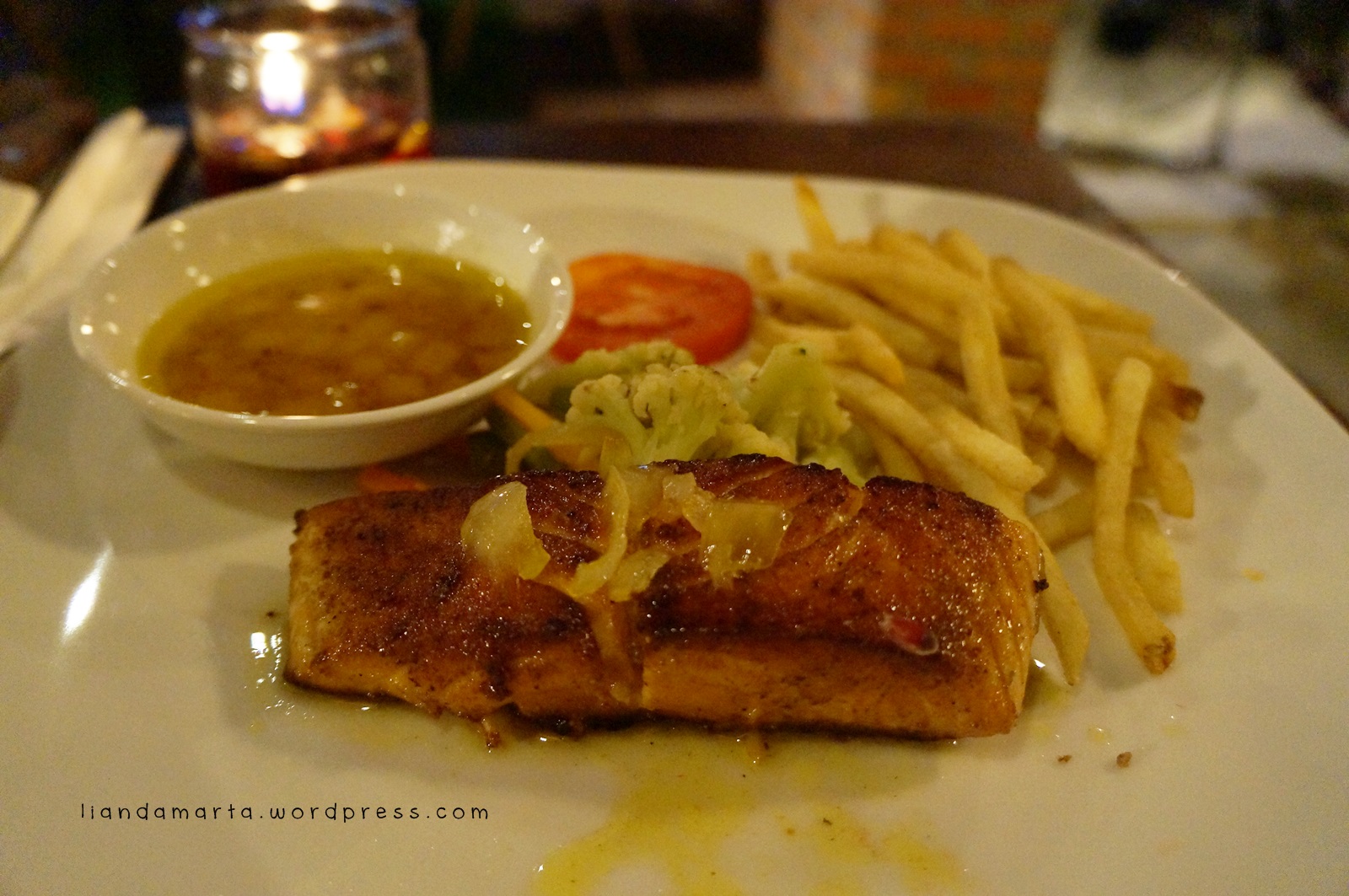 Salmon steaknya enak, gak amis dan rasa asin-gurihnya pas. Hanya saja tampilan menu si salmon ini agak kurang kece nih, soalnya piringnya kegedean. Kalo sirloin steaknya, saya lupa bedanya apa sirloin steak US dan NY (soalnya mbaknya ditanyain juga gak bisa jawab). Saya pake saus BBQ dan oh itu saus BBQ-nya enak sekaliii.. Kalo sirloinnya sih agak kurang empuk ya. Oh ya, french fries nya juara menurut saya. Ini penting banget, buat netralin rasa kalo-kalo salmon/steaknya kurang enak hihi. π