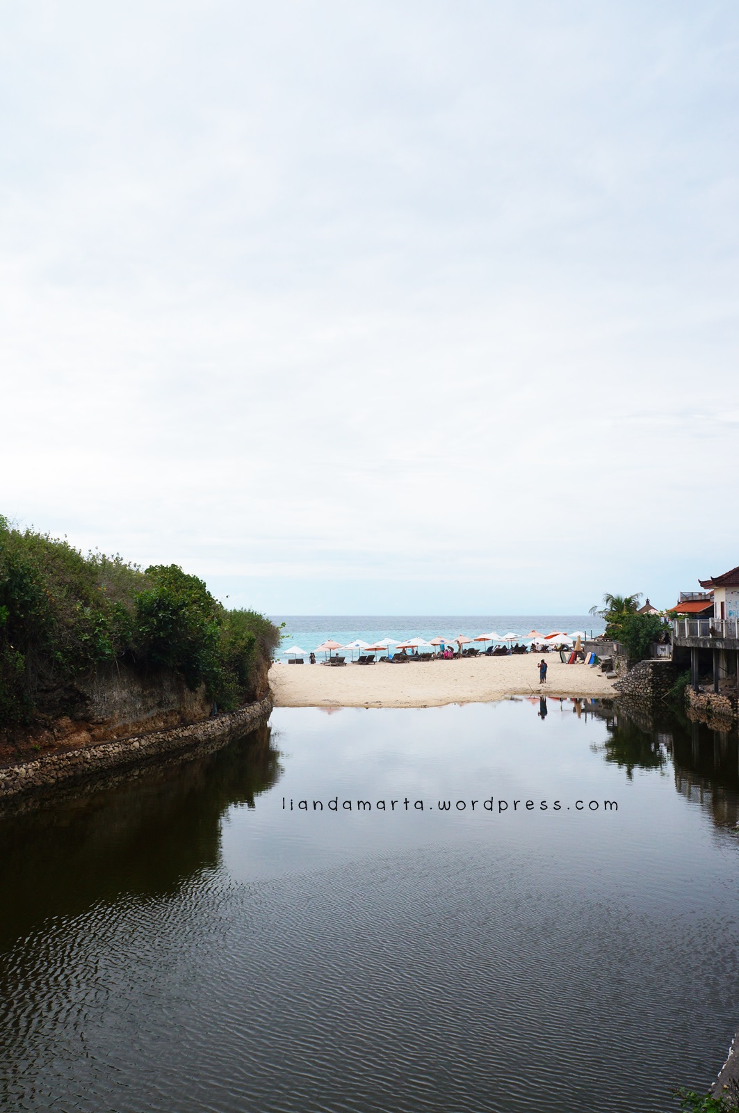 Untuk masuk ke Pantai Dreamland, mobil yang kami sewa hanya bisa berhenti di sebuah lahan parkir. Dari sana kami naik elf yang disediakan secara gratis untuk mengantarkan pengunjung ke Pantai Dreamland. Begitu sampai di lokasi, kami disambut dengan sebuah laguna kecil di sebelah kiri dan jejeran kios yang menjual kain pantai, topi, sunglasses, dsb di sebelah kanan. Dan pasir putih yang menyambut kami di ujung sana. 🙂