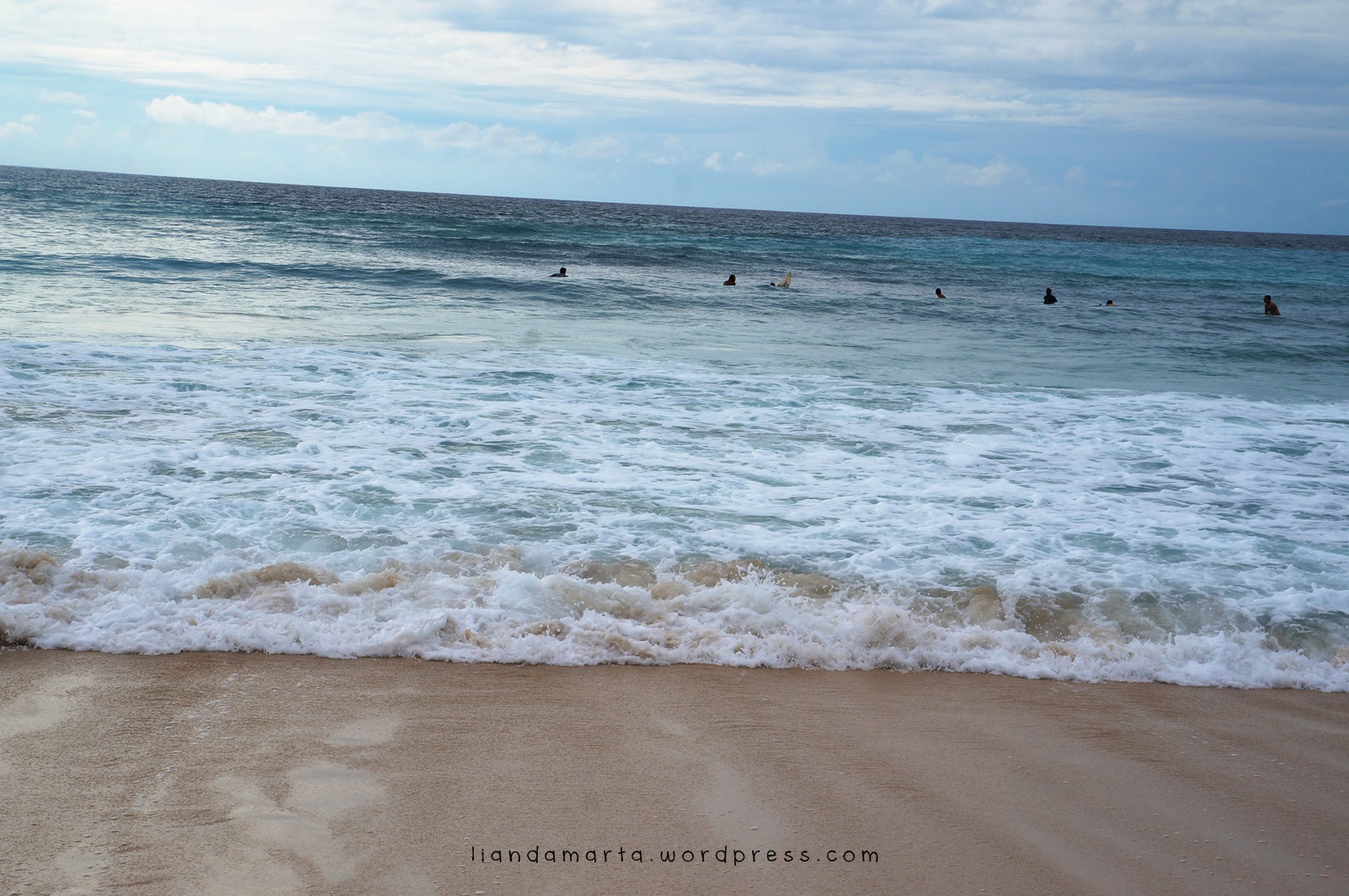 Pemandangan yang totally berbeda dengan yang ada di Pantai Pandawa, saya temukan di pantai ini. Pengunjung yang lebih ramai, cenderung lebih crowded di beberapa titik, dan ada beberapa peselancar yang sedang beraksi dengan papan selancar mereka masing-masing. Entahlah apa karena Dreamland lebih dikenal oleh wisatawan atau karena memang pantai ini dirasa lebih seru daripada Pandawa yang cenderung sepi. Tapi bagi saya masing-masing punya daya tarik tersendiri. 🙂