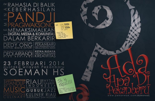 So, Wakbro dan Waksist yang ada di Pekan, kalo masih ada yang nanya “Ada Apa Di Pekanbaru?”, yok langsung datang sajalah Wak ke Pustaka Wilayah Soeman H.S. Pekanbaru, tanggal 23 Februari 2014 mendatang! Ketemu di sana aja kita, Wak! 😉