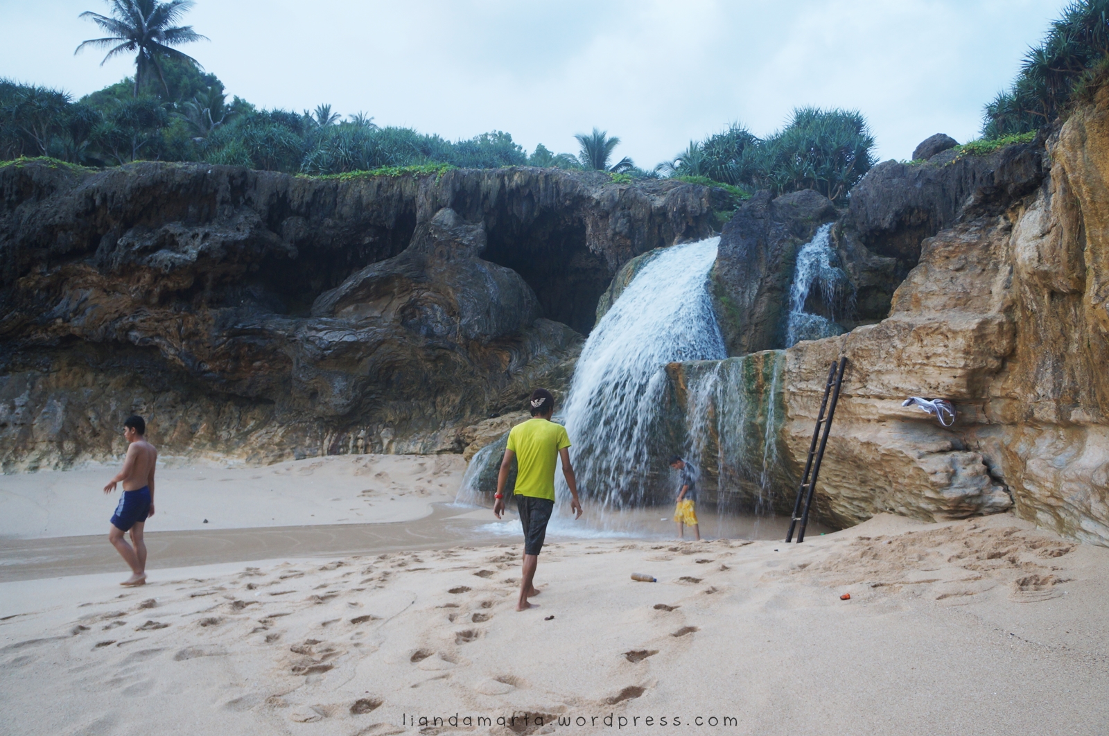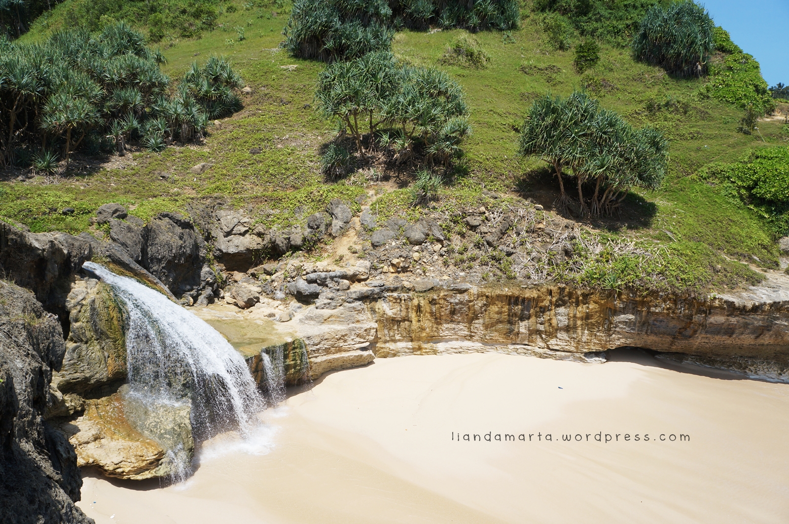 By the way, ombak di bawah amat sangat deras. Jadi kudu extra hati-hati ya, guys. Kemarin saya sok-sokan duduk sambil nikmati aliran air terjunnya, trus cuek aja pas lihat ada ombak yang gede di kejauhan. Karena biasanya kalo main di pantai kan paling cuma dihempas dikit aja ya sama ombaknya. Tapi kali ini saya terkecoh. Ternyata ombaknya super kuat dan saya sampai terhempas beberapa meter ke belakang dan kelelep air. Yang ditakutin sih kalo sampai kebentur pinggiran tebing atau hanyut dibawa ombak. Serem ya! 😦