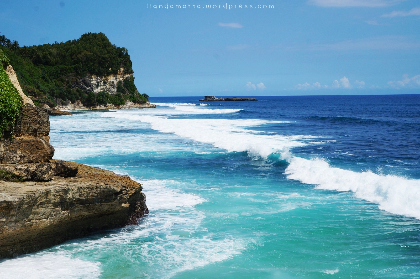 Pemandangannya bikin segar mata ya! Langit biru, air laut yang juga biru, hijaunya pepohonan di sekitar dan buih ombak yang berwarna putih. I really like it! 🙂