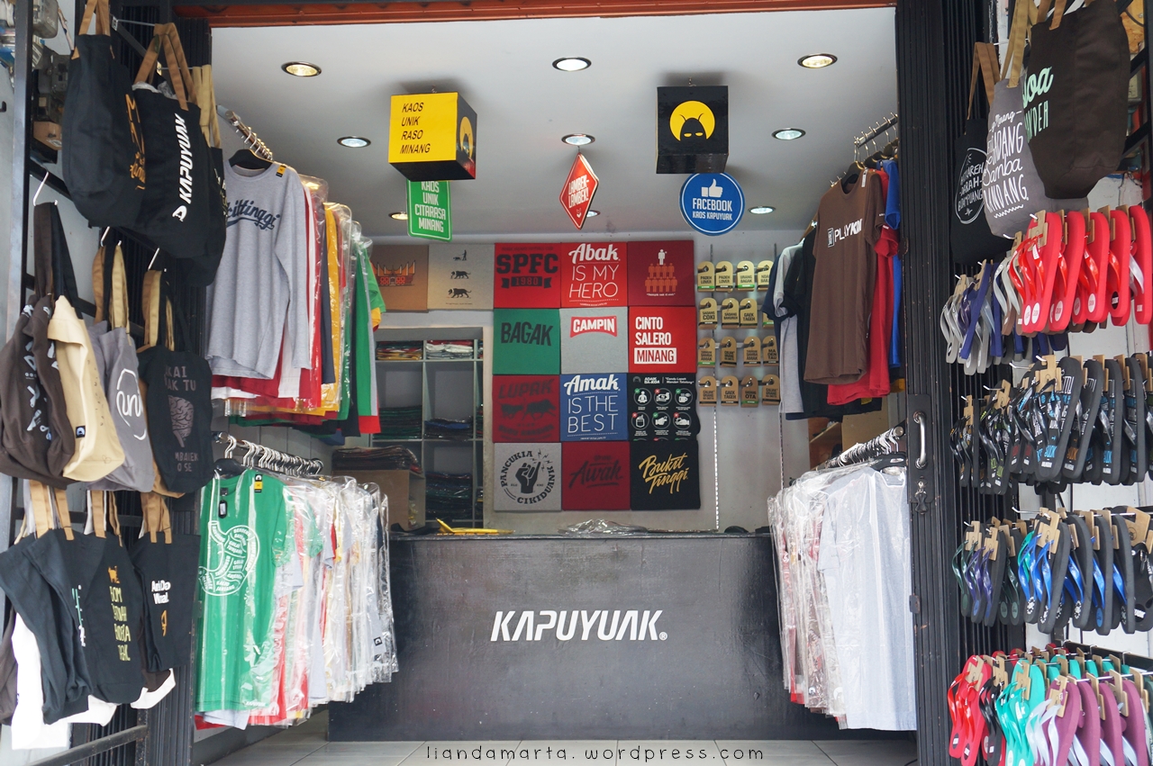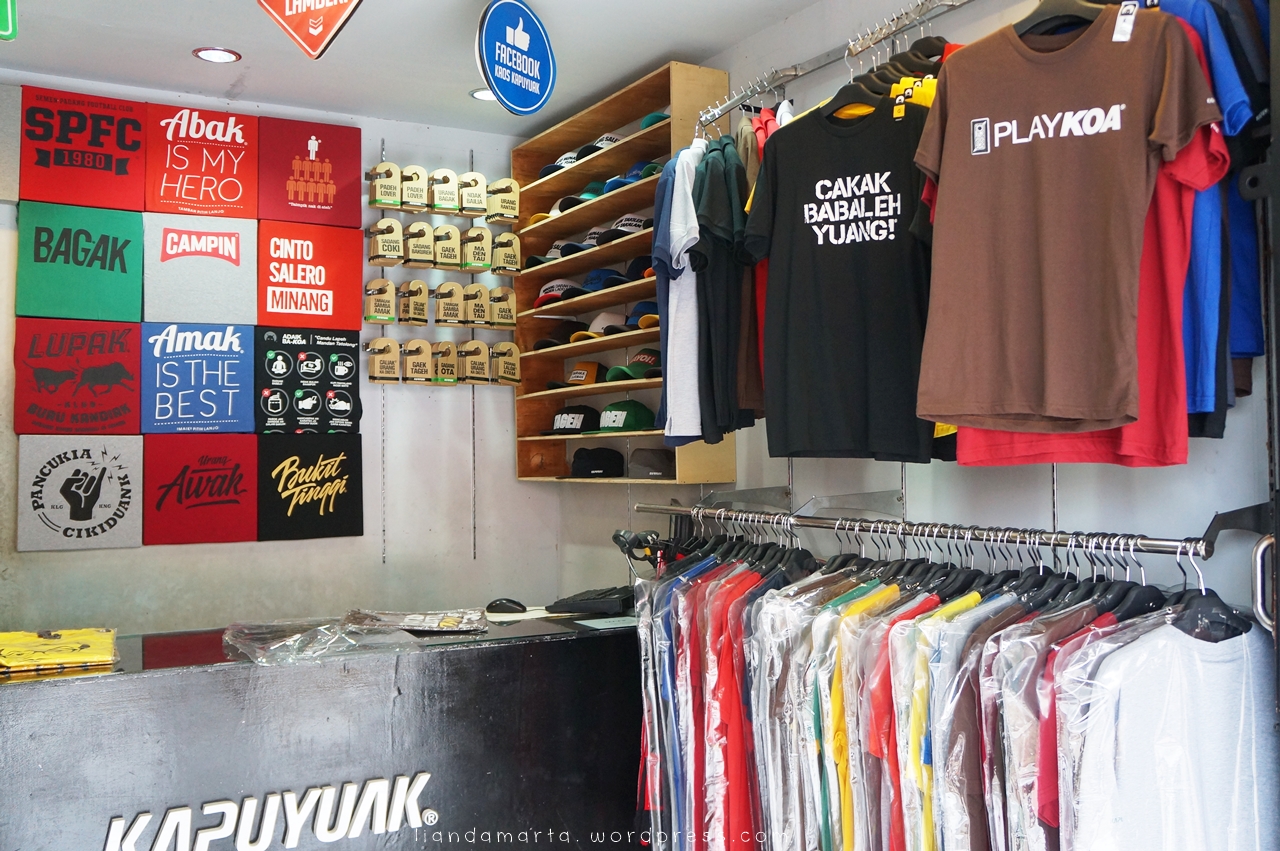 Demi adik tersayang, sebelum pulang ke Pekanbaru, saya sempatkan mampir ke salah satu outlet Kapuyuak ini. Lokasi outletnya di Bukit Tinggi, dekat Jam Gadang. Layaknya outlet distro lainnya, outlet Kapuyuak ini gak terlalu besar. Karena outletnya yang gak terlalu besar itulah, kalo pengunjung lagi ramai, berlama-lama di outlet ini cukup bikin pusing. Bersyukurlah saya, saat datang ke sana lagi weekdays dan pengunjungnya lagi sepi. Saya jadi bebas milih-milih deh. 😀