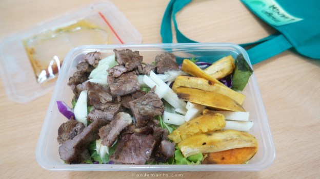 Untuk makan siang, tadi agak telat sih kurirnya datang. Jadi saya baru mulai makan jam setengah 1 siang. Menunya ada daging dan sayuran mentah. Ada semacam minyak juga, tapi saya gak tau itu minyak apa. Olive oil kali ya? 😀